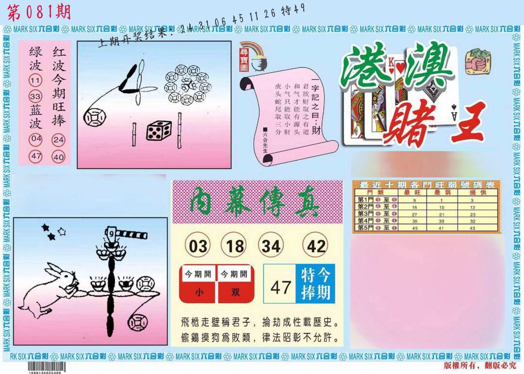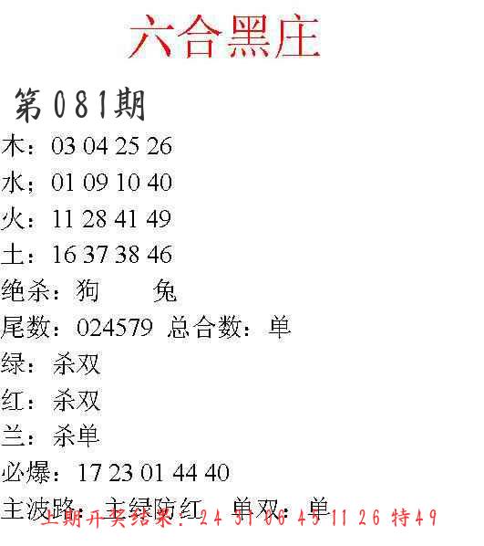 准确率高达90%,期期挑出12-18码 ____________★____________ 【九肖】 081期【鸡兔马蛇羊猪狗虎鼠】开????? 080期【鸡兔马龙猪虎羊猴狗】开49马对 079期【兔猴龙虎狗猪牛羊蛇】开22鸡错 078期【牛蛇狗马猴兔猪龙鼠】开37马对 077期【龙猴鼠鸡兔猪狗蛇马】开30牛错 076期【牛鼠龙兔猴虎马猪蛇】开08猪对 075期【猴羊蛇虎猪狗鼠马鸡】开23猴对 074期【猪狗牛虎龙兔蛇羊鼠】开28兔对 ____________★____________ 【四头】 081期【1-0-3-4】开?????? 080期【1-4-2-0】开49马对 079期【0-1-2-3】开22鸡对 078期【2-4-1-0】开37马错 077期【0-3-4-2】开30牛对 076期【2-0-4-1】开08猪对 075期【3-4-2-0】开23猴对 074期【1-4-3-0】开28兔错 ____________★____________ 【四行】 081期【金-木-水-土】开?????? 080期【木-土-金-水】开49马错 079期【金-木-土-水】开22鸡对 078期【火-土-木-水】开37马对 077期【水-金-木-火】开30牛对 076期【火-金-水-土】开08猪错 075期【金-水-土-木】开23猴对 074期【土-火-水-木】开28兔对 ____________★____________ 【七尾】 081期【5-8-1-3-6-9-4】开????? 080期【6-4-0-5-3-1-9】开49马对 079期【8-6-1-7-9-2-3】开22鸡对 078期【7-3-5-6-8-0-9】开37马对 077期【2-4-0-9-6-8-7】开30牛对 076期【2-9-4-5-3-8-1】开08猪对 075期【0-7-9-2-4-3-6】开23猴对 074期【0-7-2-4-5-9-6】开28兔错 ____________★____________ 【双波】 081期【绿波+红波】开????? 080期【绿波+蓝波】开49马对 079期【蓝波+绿波】开22鸡对 078期【红波+绿波】开37马错 077期【红波+蓝波】开30牛对 076期【蓝波+红波】开08猪对 075期【蓝波+红波】开23猴对 074期【红波+绿波】开28兔对 ____________★____________ |